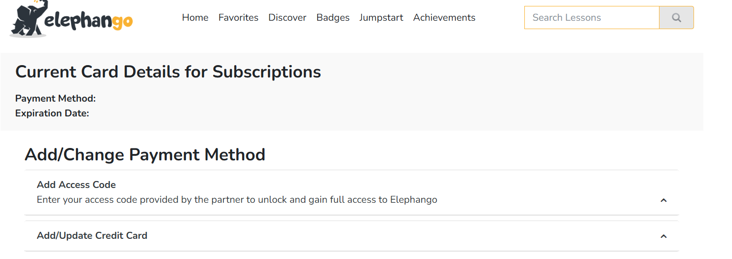 To renew your Elephango subscriptions, parents should access their State Wallet Program and purchase another year of Elephango. Once tthe order is submitted, you will receive an email with a new access code.To redeem the access code, log into your existing Elephango account and click on your user name in the upper right and select Subscription. From there, select Add/Change Method of Payment to enter your access code. Then click on Add Access CodeEnter the access code from your email we provide.Enter the code and hit Submit and you’re done.